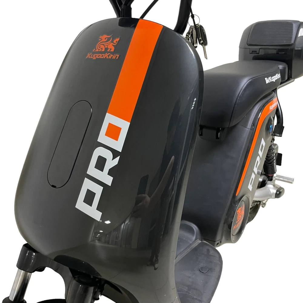 ЭЛЕКТРОСКУТЕР KUGOO V PRO 20 AH - мощный электроскутер в черном цвете выглядит серьезно и устрашающе в сравнении с предыдущей линейкой тс. Переливающееся под солнечными лучами лакокрасочное покрытие с брендовой надписью нравится продвинутым райдерам и новичкам. Модель, изготовленная с учетом пожеланий пользователей и наблюдений производителя, стала лидером продаж этого года. Купить электробайк выгодно, по приемлемой стоимости предлагает наш интернет-магазин.