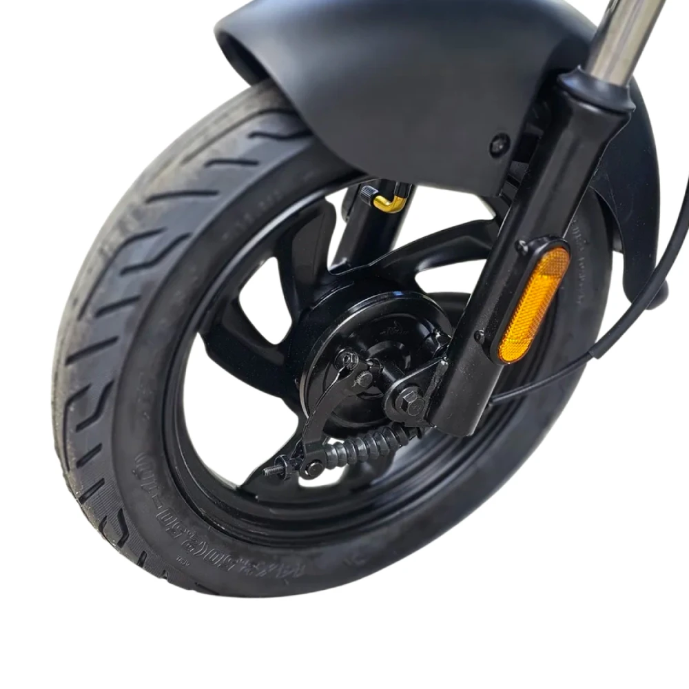 Большие 10-дюймовые колёса обеспечивают устойчивость и хорошее сцепление с дорогой, а влагозащита IP54 позволяет кататься даже в дождливую погоду. Максимальная нагрузка до 150 кг делает скутер подходящим для разных райдеров.