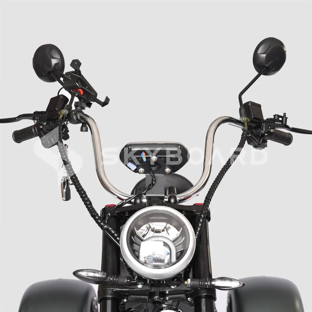 Электроскутер SKYBOARD TRIKE CHOPPER-4000 PRO FAST – мощный и эксклюзивный, первое, что приходит на ум при визуальном ознакомлении с техникой. Изогнутая рама, брутальный дизайн наталкивают на мысли о максимальных скоростях и непередаваемых ощущениях. Со слов производителя предчувствие клиентов является правильным.