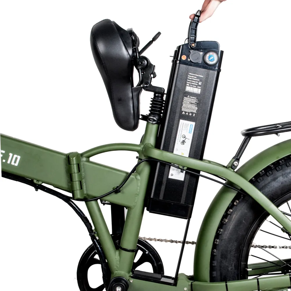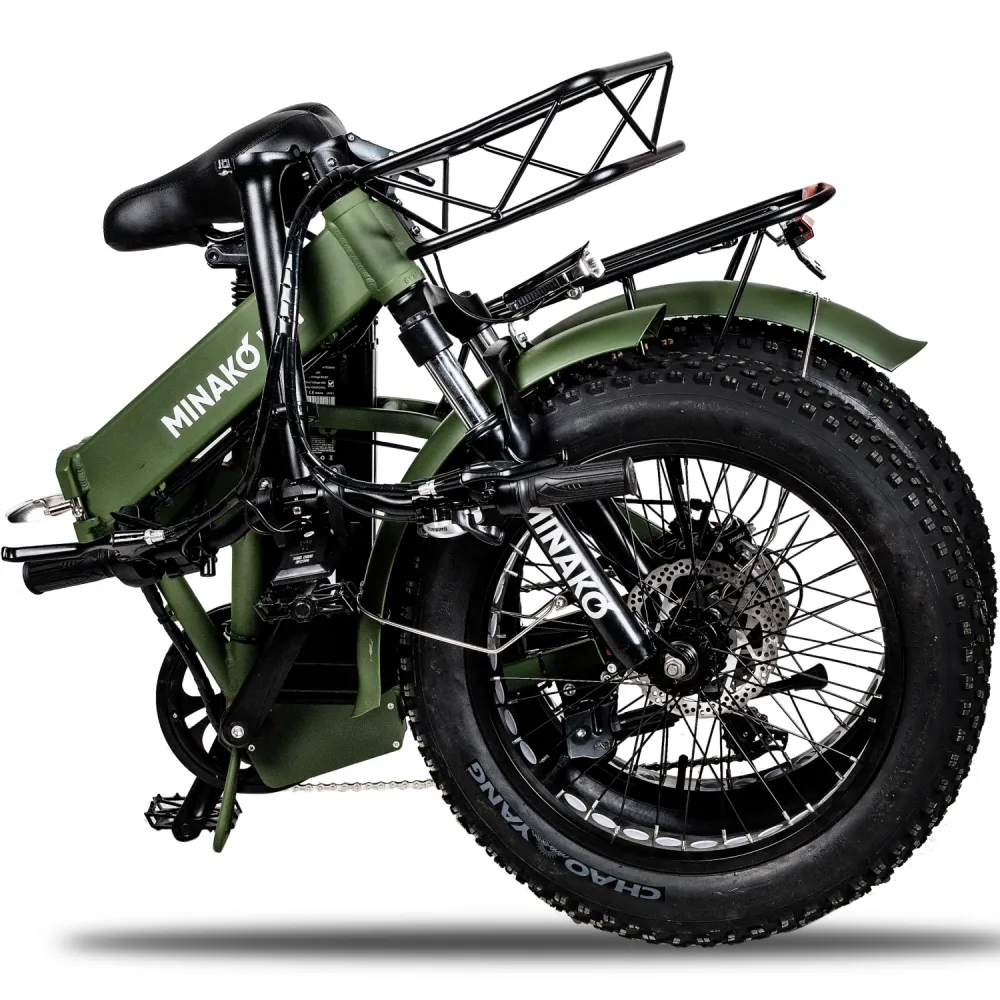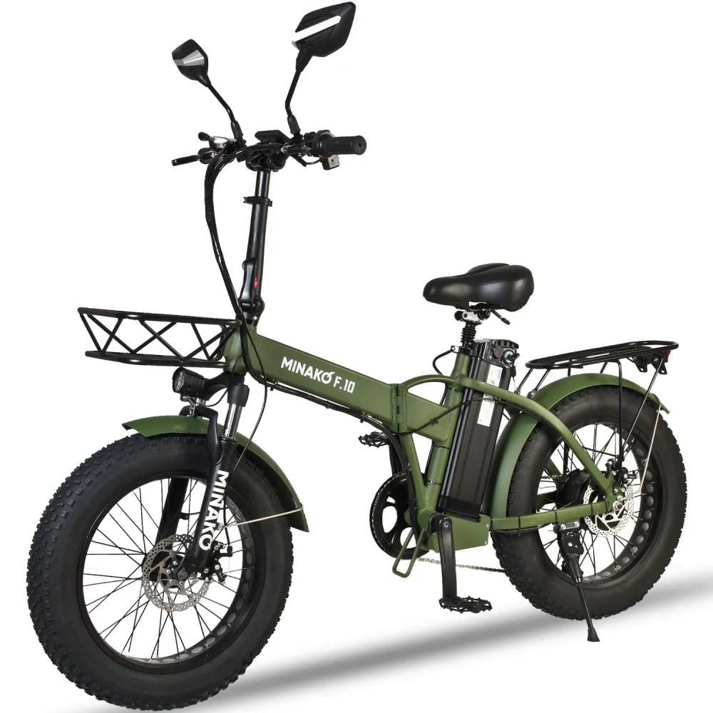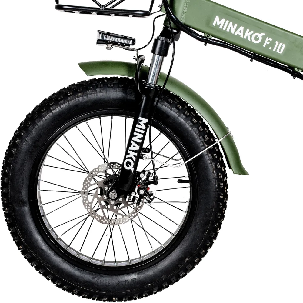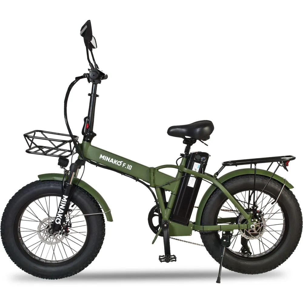 ЭЛЕКТРОВЕЛОСИПЕД MINAKO F10 хаки – выглядит круто и броско в сравнении с аналогичной техникой. При весе 27 кг модель рассчитана на грузоподъемность до 120 кг. Технические характеристики допускают эксплуатацию байка в городской и дачной местности. Для приобретения модели по приемлемой цене предлагаем сделать телефонный звонок менеджеру нашего интернет-магазина.
