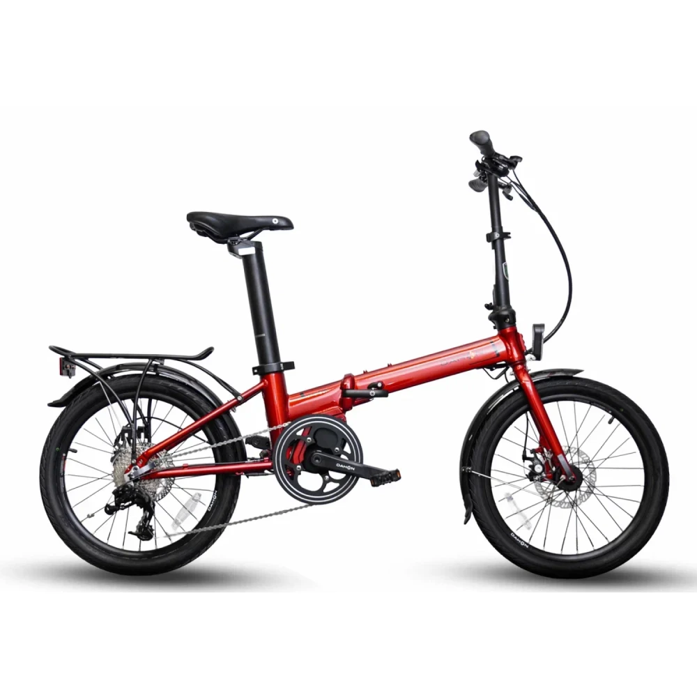 Складной электровелосипед DAHON UNIO E20 в красном цвете представляет собой легкий (12,2 кг) городской вариант с 20-дюймовыми колесами, подходящий для райдеров ростом 148-190 см. Алюминиевая рама обеспечивает прочность и компактность, делая его идеальным для ежедневных поездок и транспортировки в общественном транспорте. Модель сочетает механическую простоту с электрической поддержкой, фокусируясь на портативности без излишеств мощного мотора.
