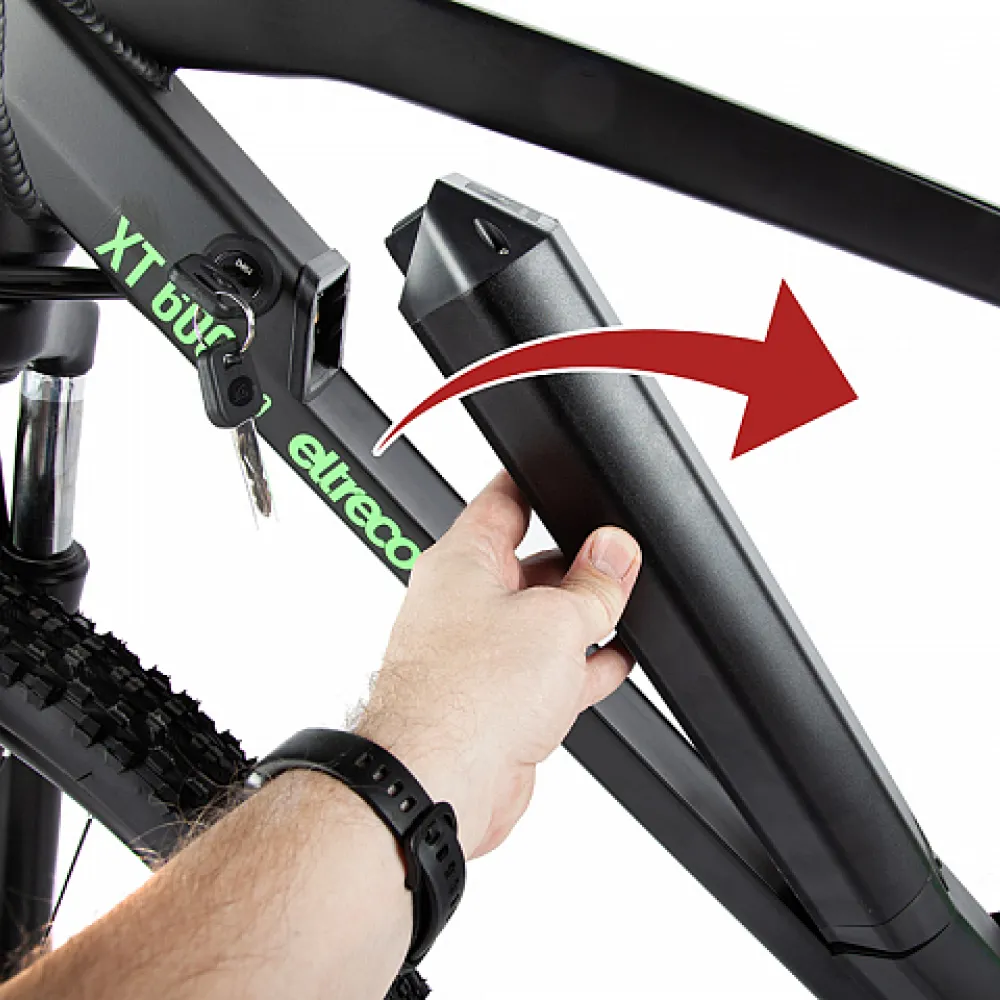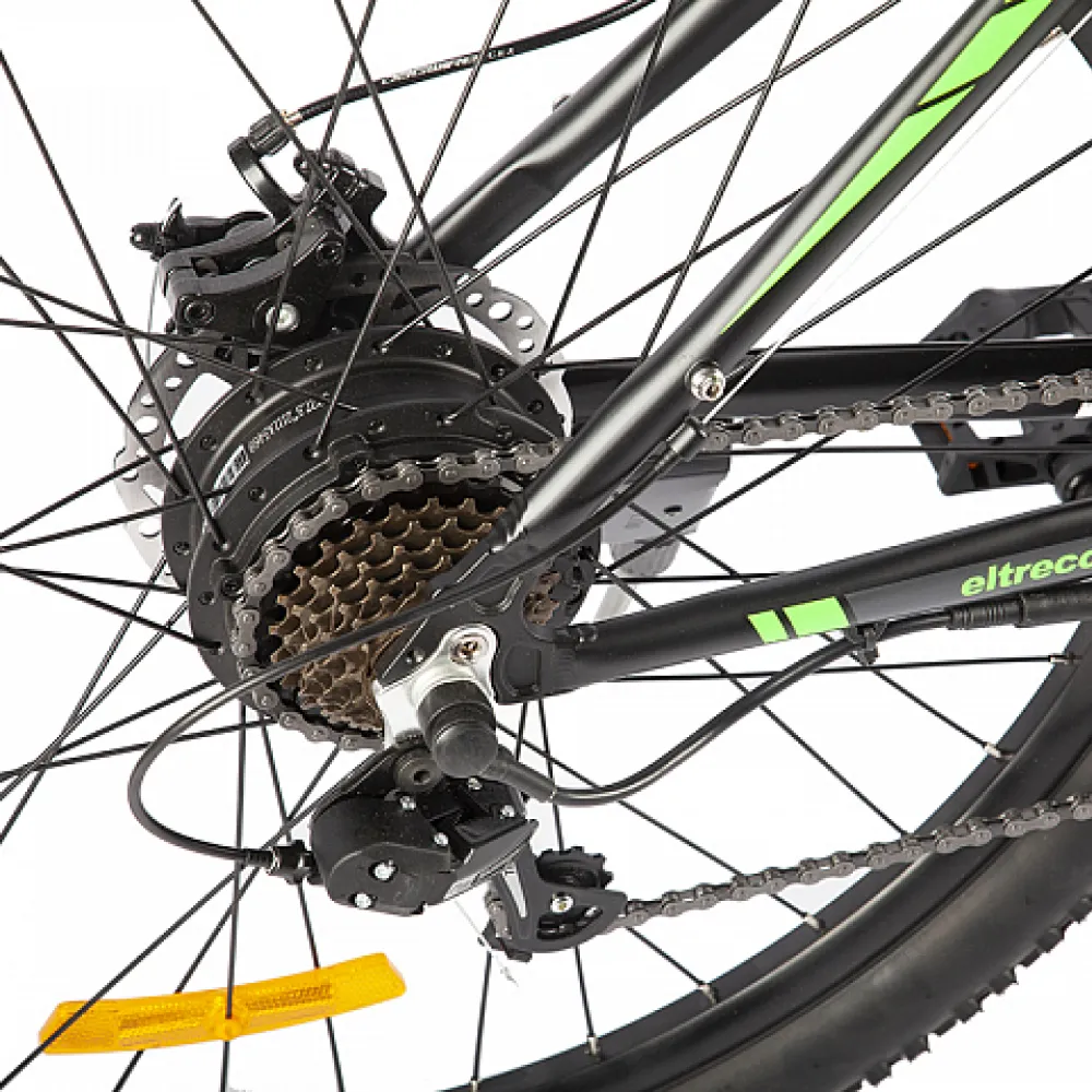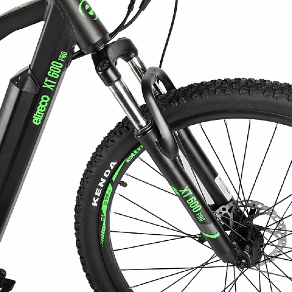 Велогибрид Eltreco XT 600 Pro в черно-зеленом цвете - это надежный и мощный спутник для всех любителей активного отдыха и комфортной езды.