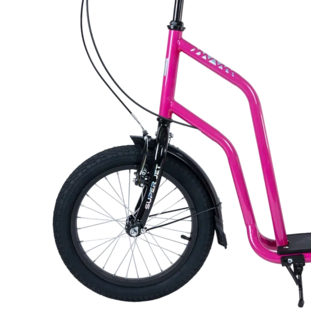 Tech Team Super Jet 700 2024 года в ярком розовом цвете - это городской самокат с уникальным дизайном, напоминающим велосипед. Большое переднее колесо диаметром 406 мм и заднее колесо диаметром 305 мм обеспечивают отличную устойчивость и комфорт при езде. Ободные тормоза и велосипедный руль с двумя ручками тормоза обеспечивают надежное торможение и удобное управление. Максимальная нагрузка до 100 кг позволяет использовать самокат людям разного веса. Рама из алюминия делает самокат легким и прочным, его вес составляет всего 8,1 кг. Этот самокат идеально подходит для активных городских поездок.