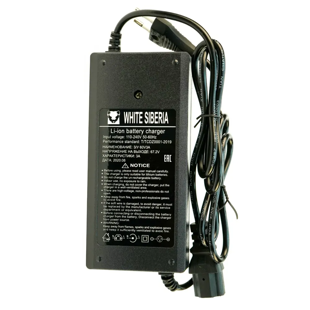 Зарядное устройство 60V3Ah T-образное от White Siberia - ваш надежный помощник в зарядке электроскутера или электросамоката. С напряжением 67,2V и мощностью 3Ah, оно обеспечивает быструю и эффективную зарядку. Т-образный разъем с тремя пинами гарантирует надежное соединение, а входные характеристики 100-240 VAC; 50/60Hz позволяют использовать устройство в разных электросетях. Это зарядное устройство - выбор тех, кто ценит время и качество.